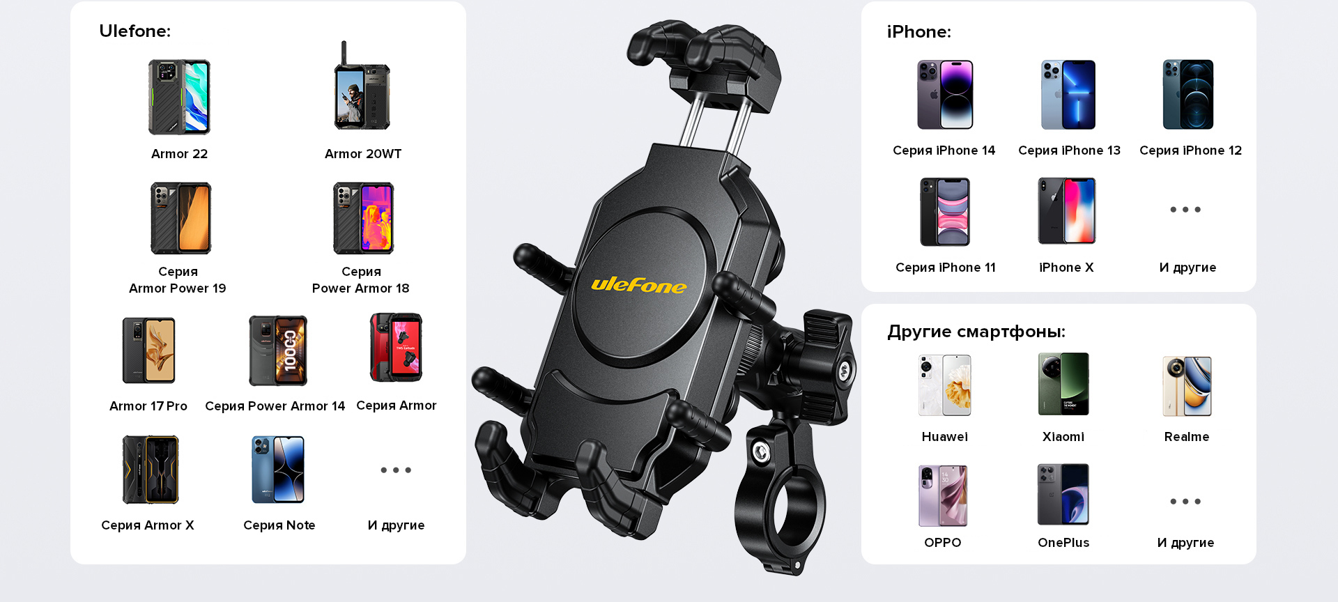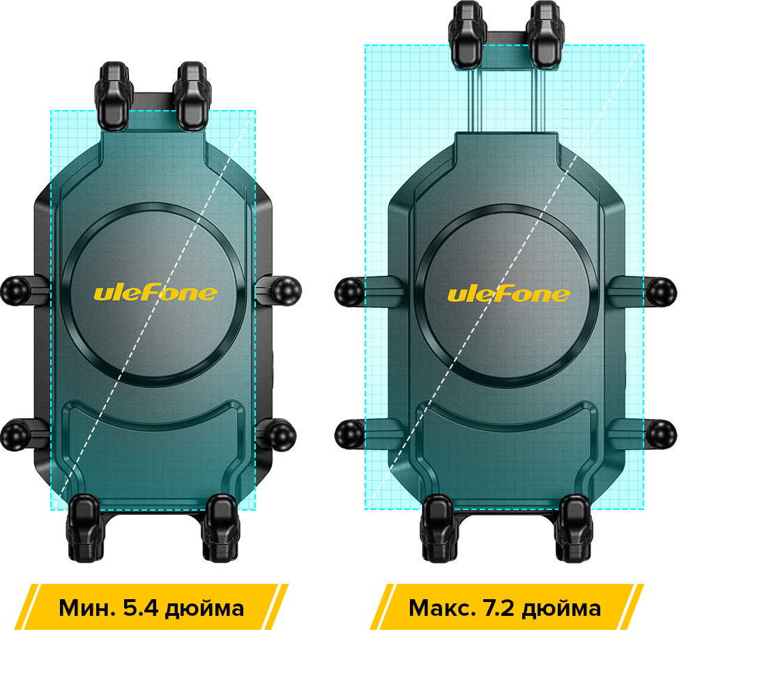 Универсальный держатель Ulefone Armor Mount Pro можно использовать с телефонами от 5.4" до 7.2", можно прямо в чехле*.